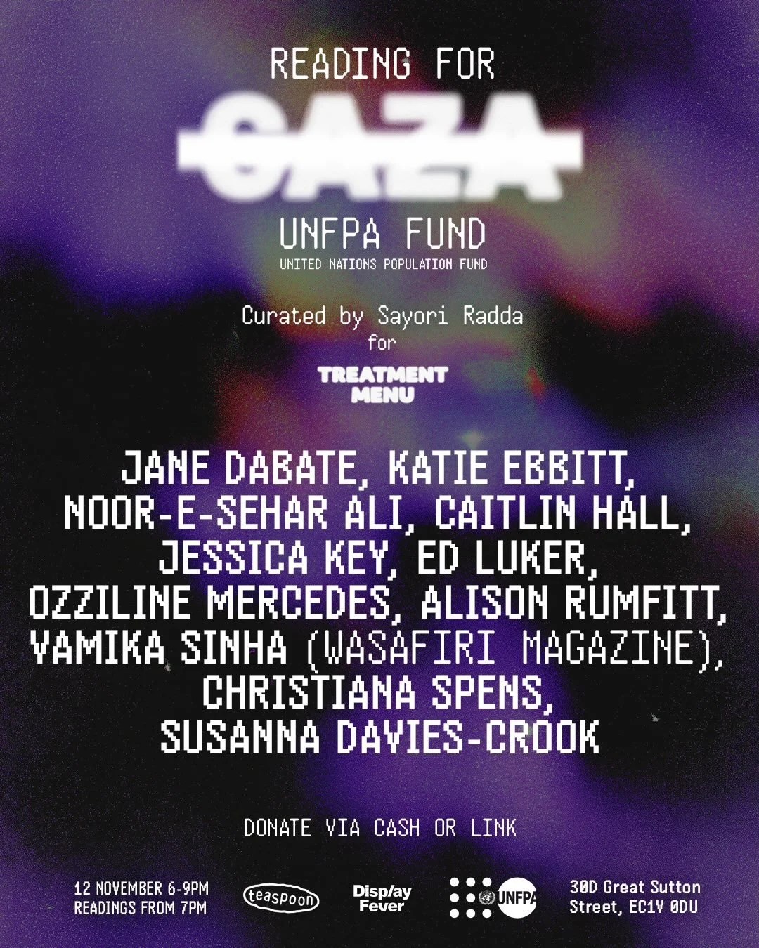 I was invited by writer and curator Sayori Radda to read some poems for this Reading for Gaza – with all donations going to the United Nations Population Fund – as part of the closing event for the exhibition Treatment Menu, hosted by Teaspoon Projects and Display Fever in London.